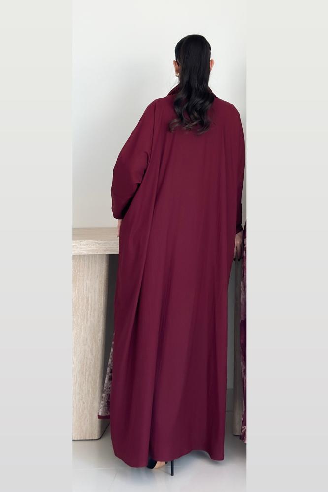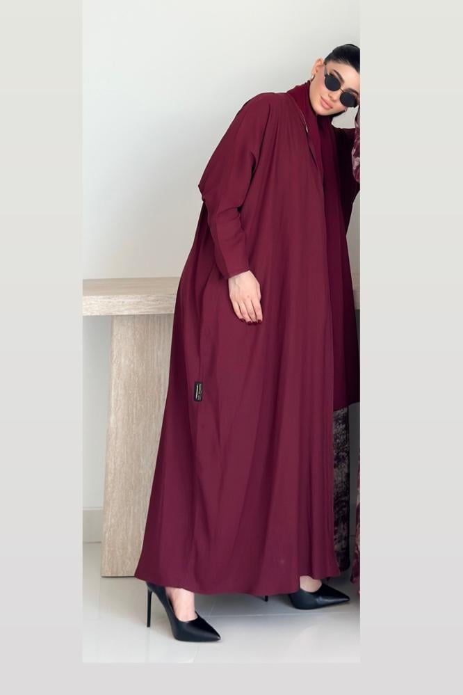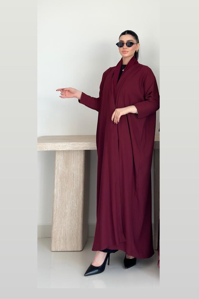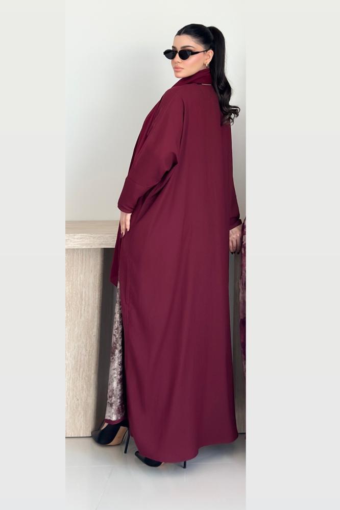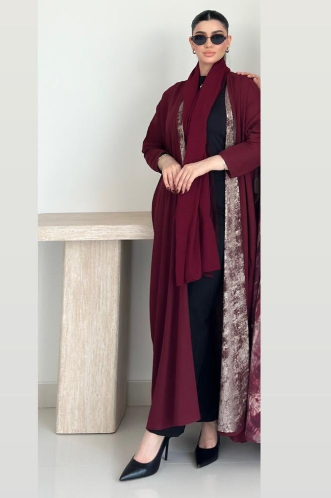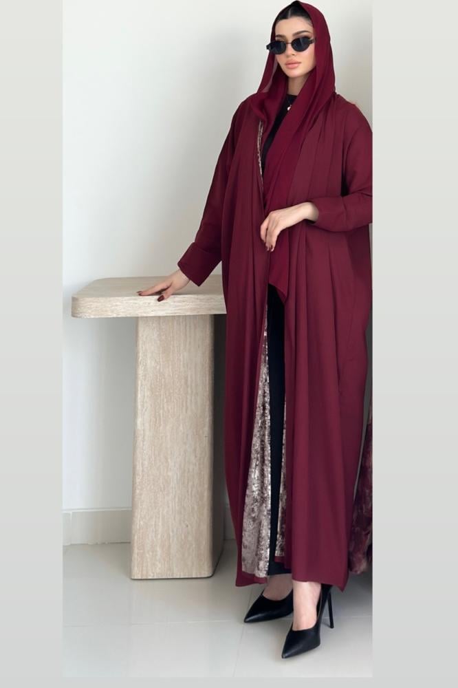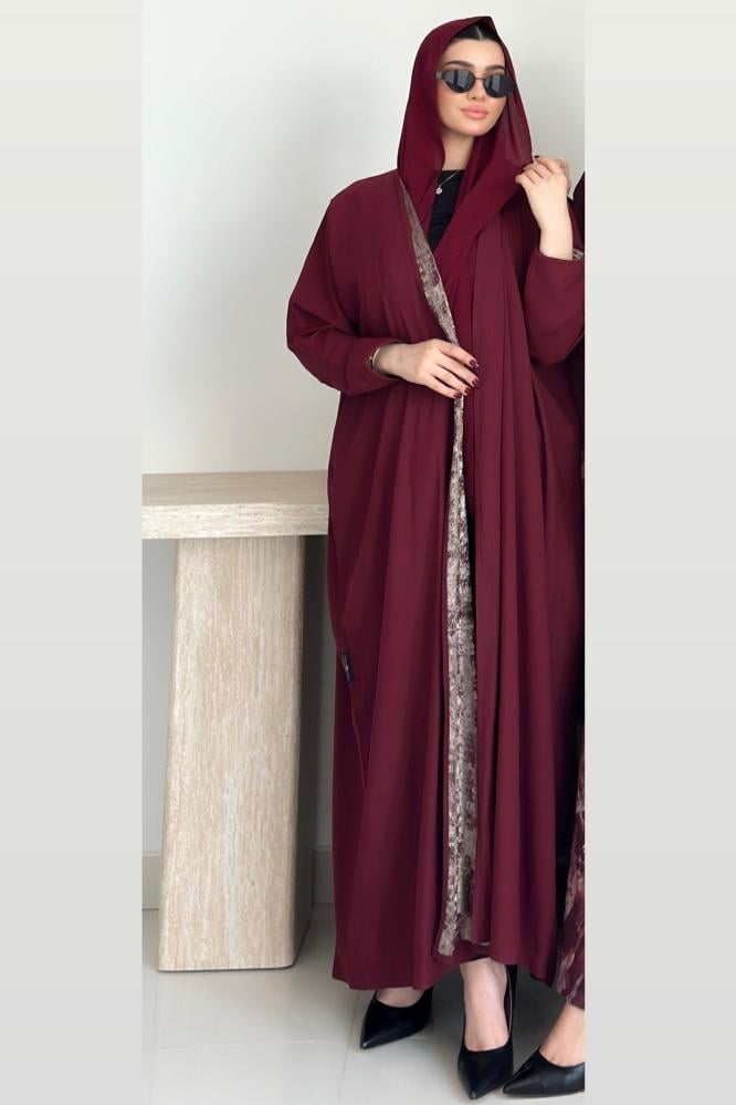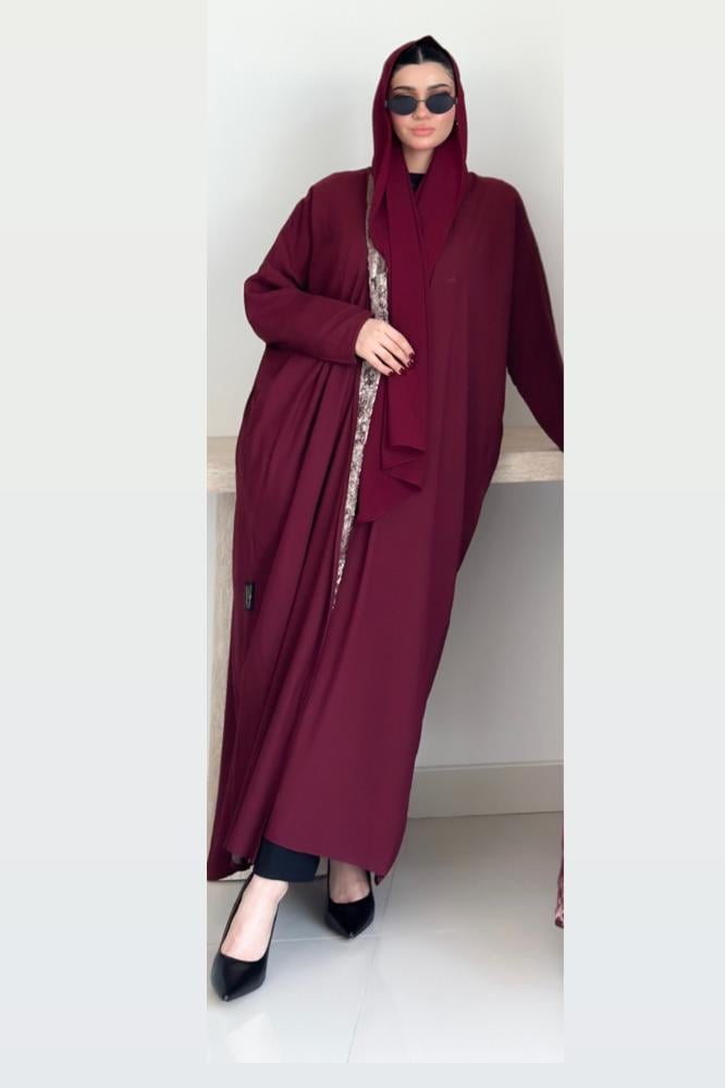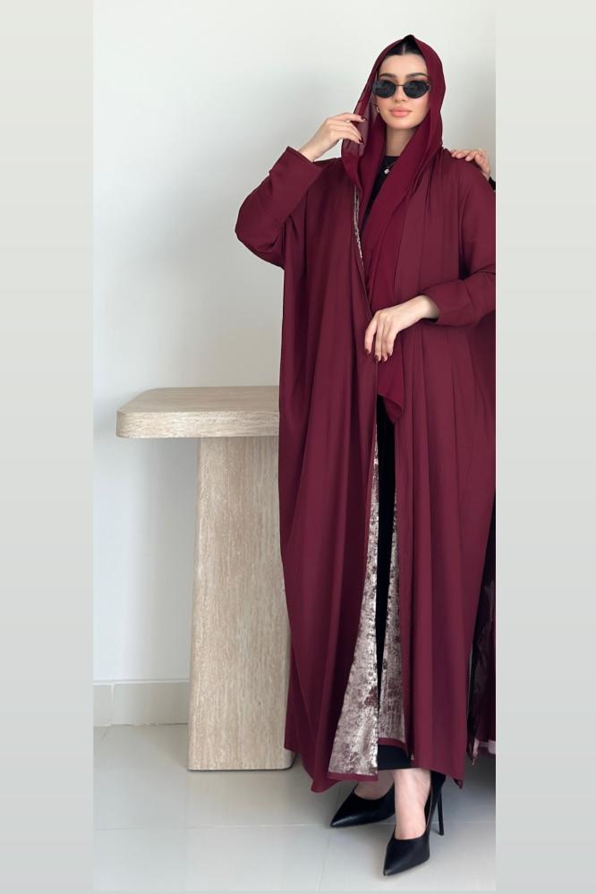 عبايه حرير لاميه دبل فيس تلبس عالوجهين وجه عنابي و وجه ذهبي مطفي مع طرحة عنابي نفس اللون محدده بالطول بتل عنابي