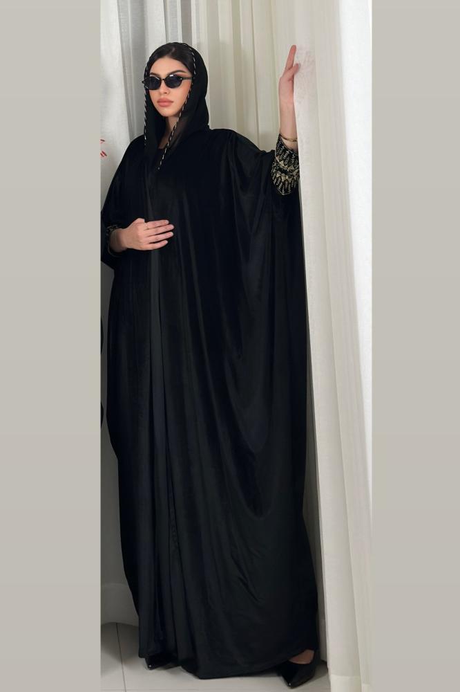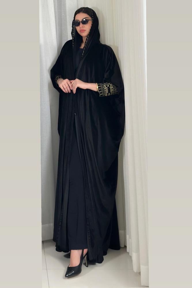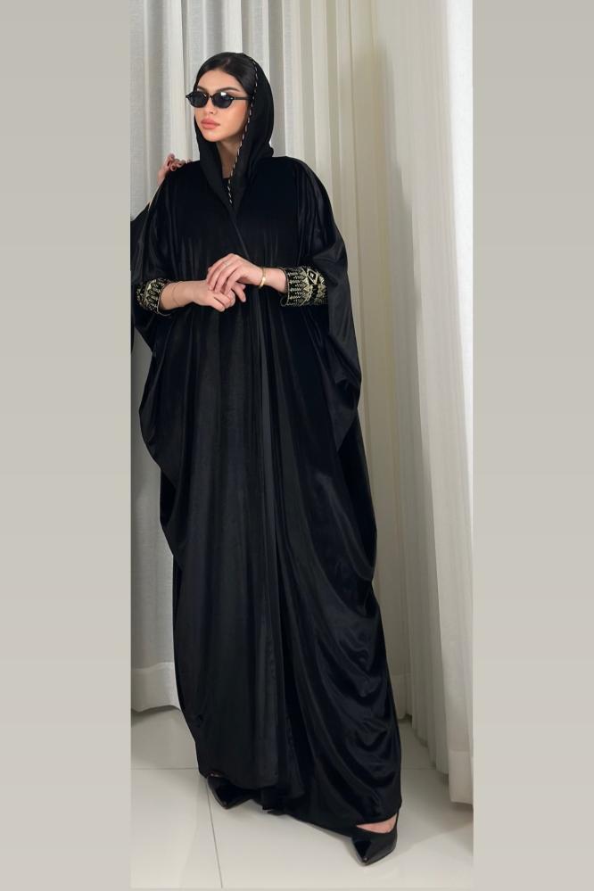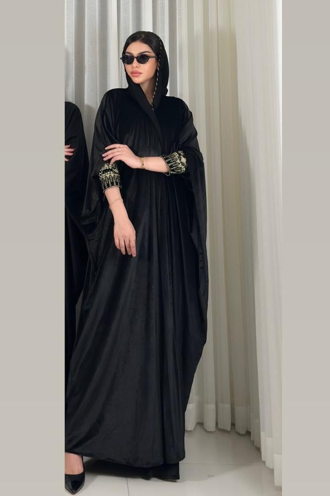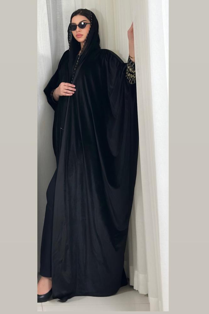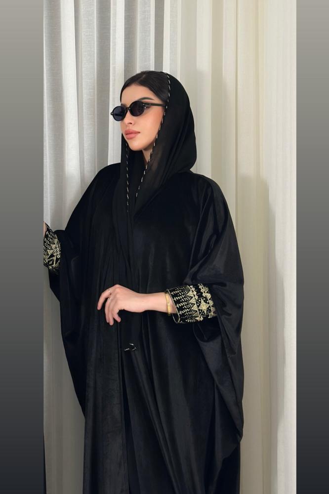 عبايه بشت مخمل والأسوار كلفة مخمل وذهبي والطرحة اسودّ محددة بقيطان أسود وذهبي