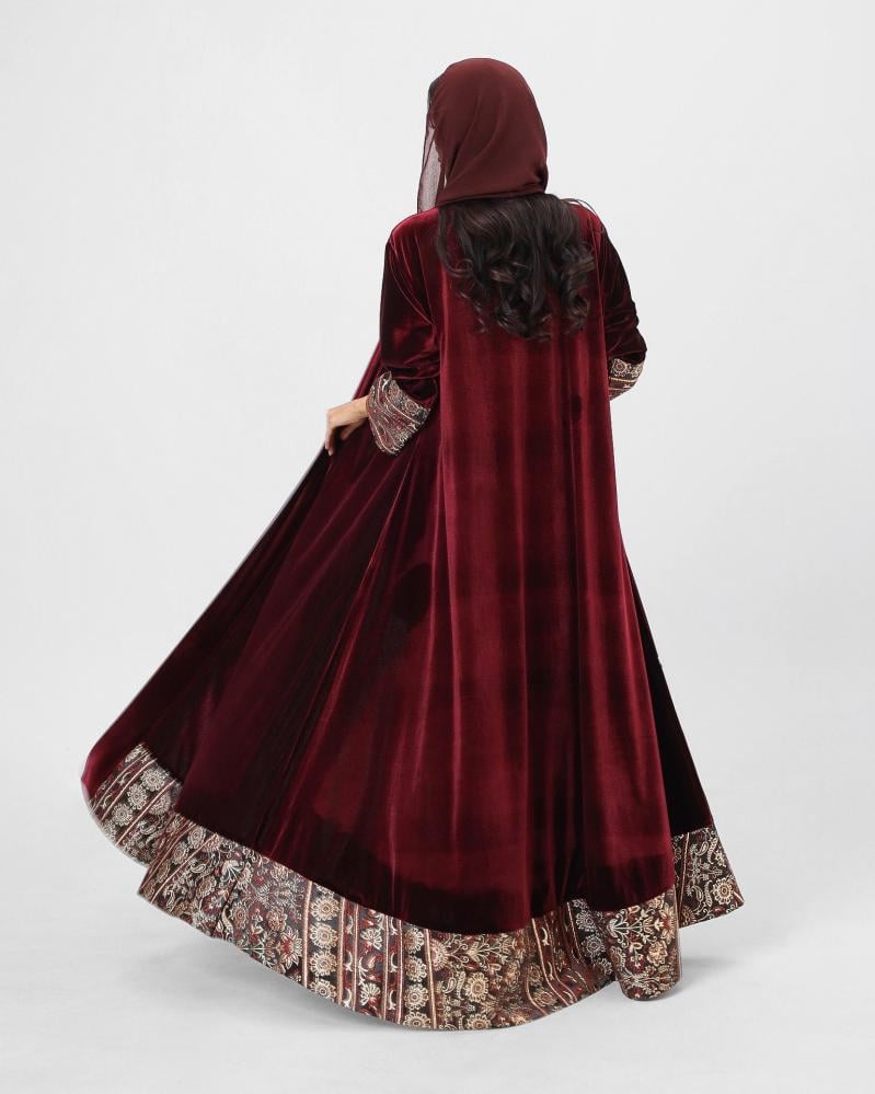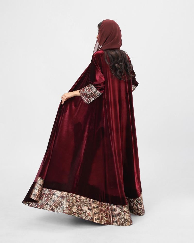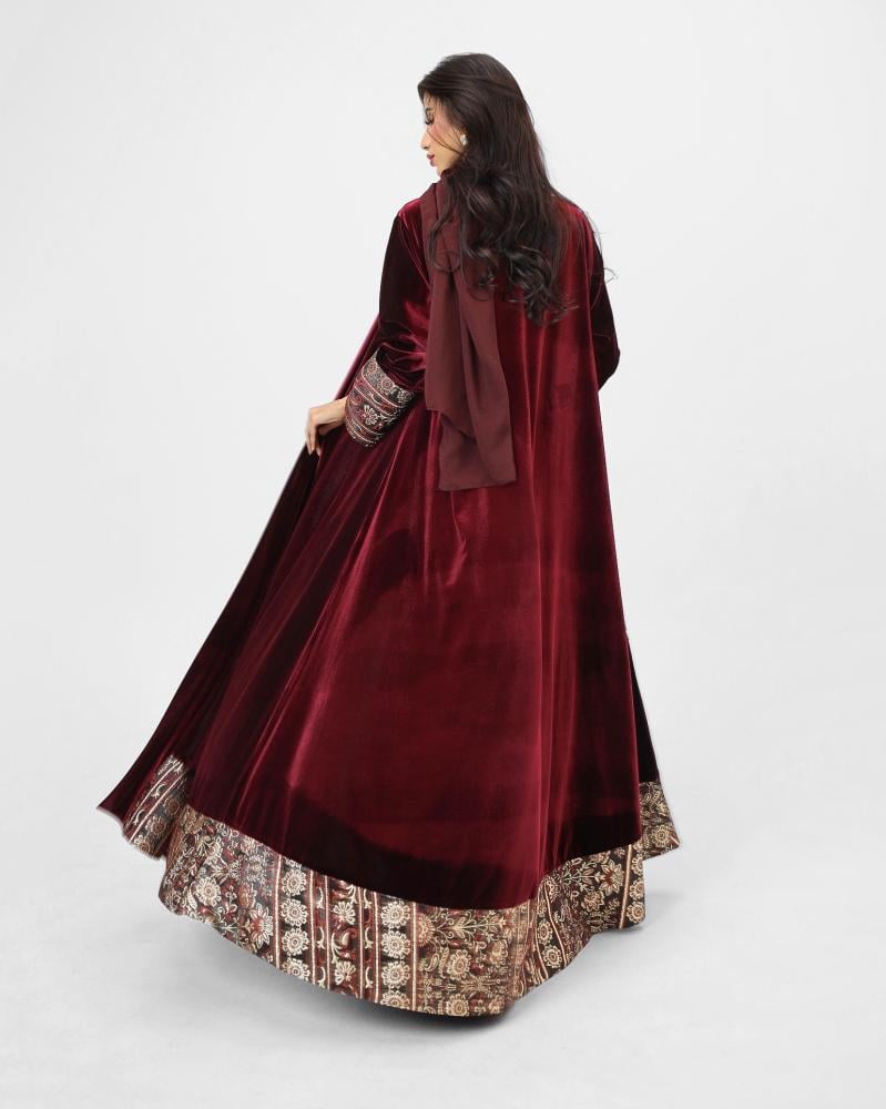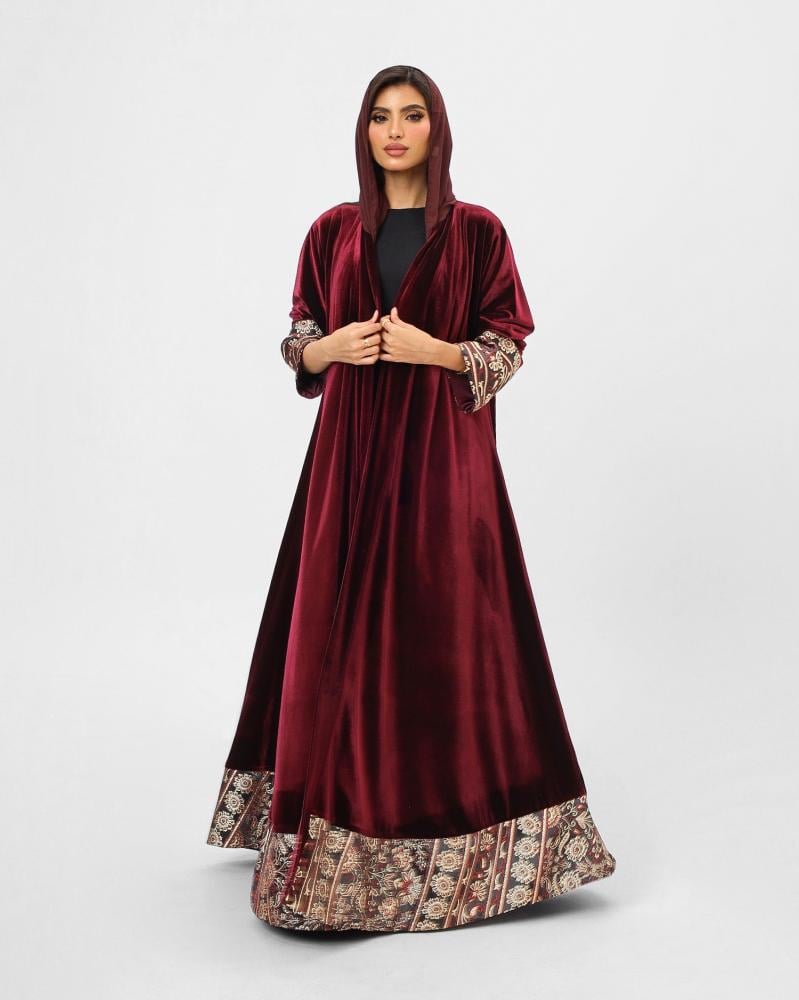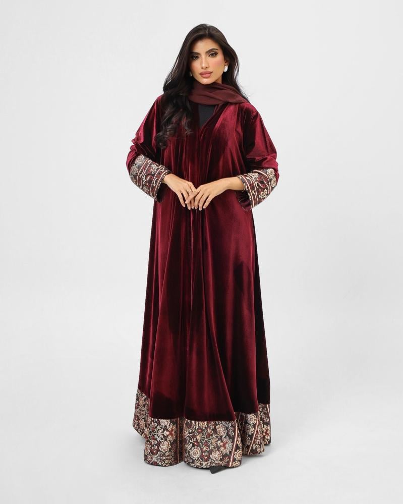 عباية مخمل عنّابي فاخرة بتصميم انسيابي ناعم، تأتي بقصّة كلوش واسعة تزيد من جمال انسيابها أثناء الحركة. أطراف الأكمام وأسفل العباية مُحددة بخامة مطرّزة بدقّة، تضيف لمسة أناقة لافتة دون مبالغة. وتكتمل الإطلالة بـ طرحة عنّابية متناغمة مع لون العباية، ليبدو الطقم كله بوقار وجمال متناسق.
