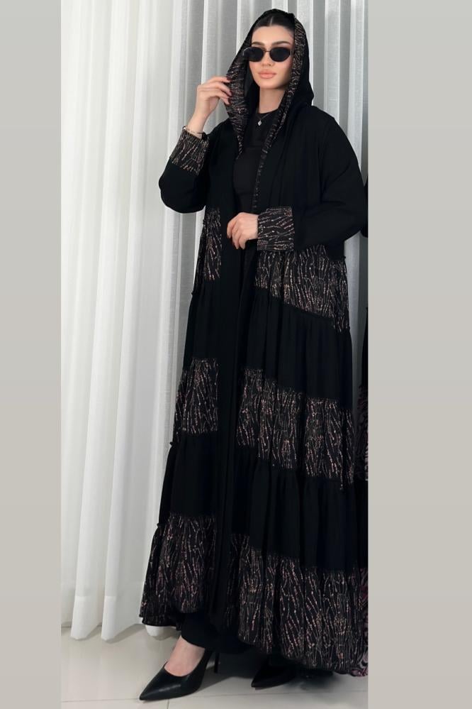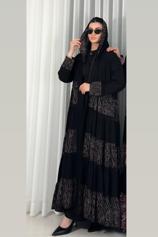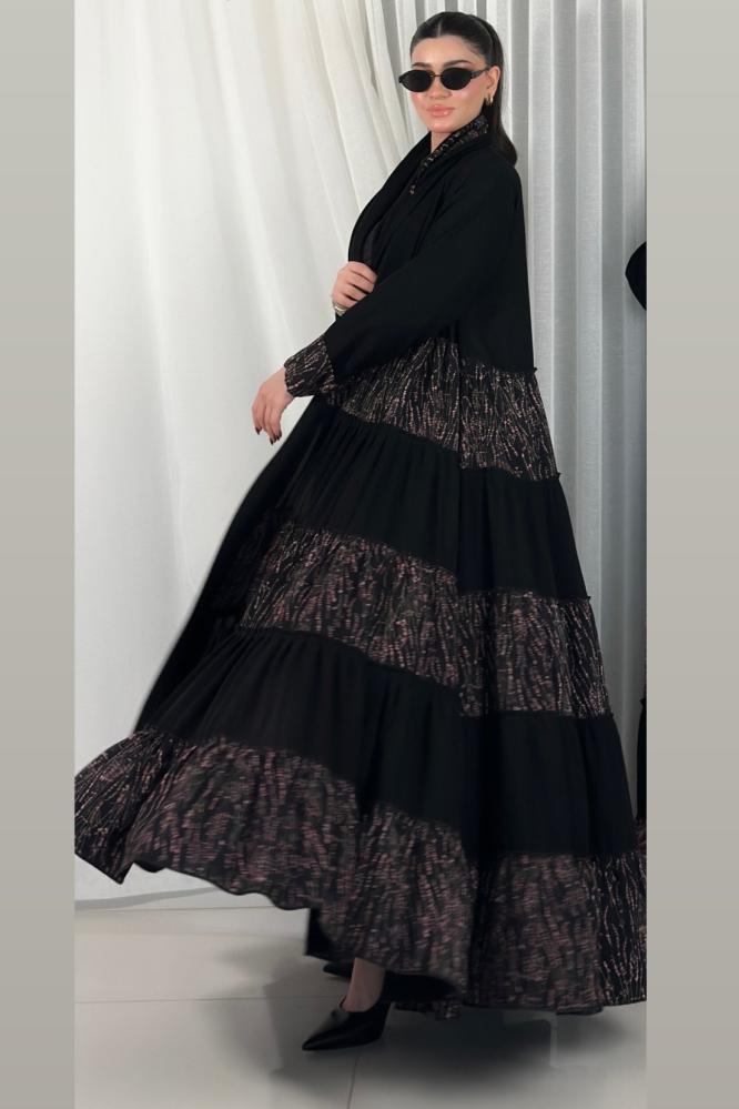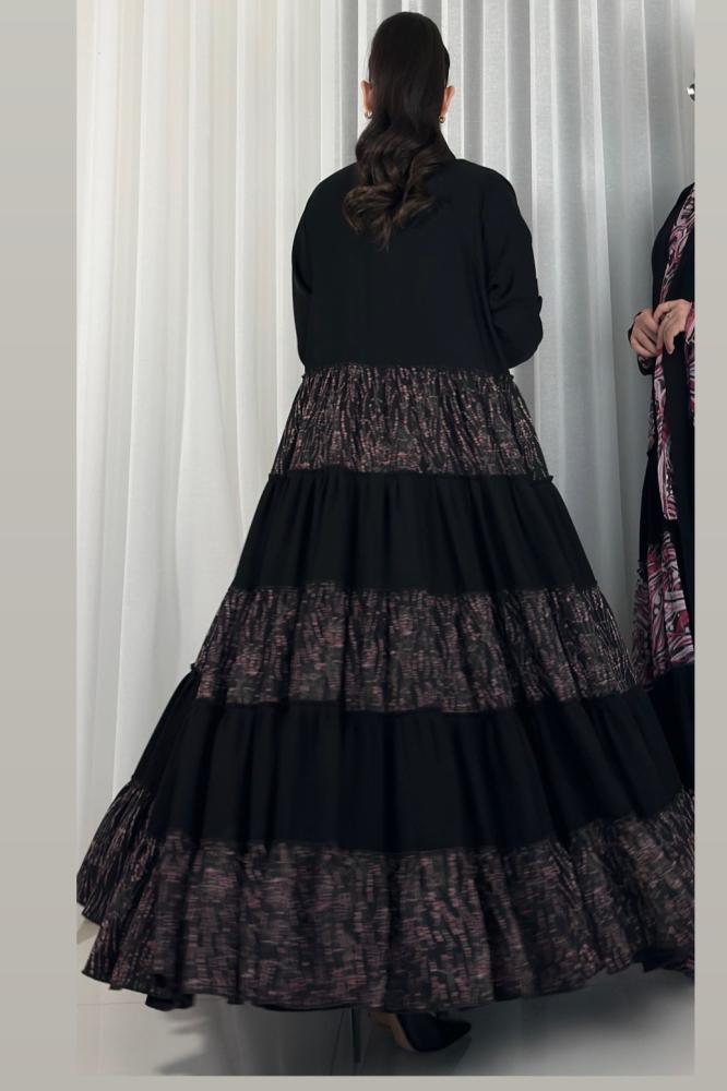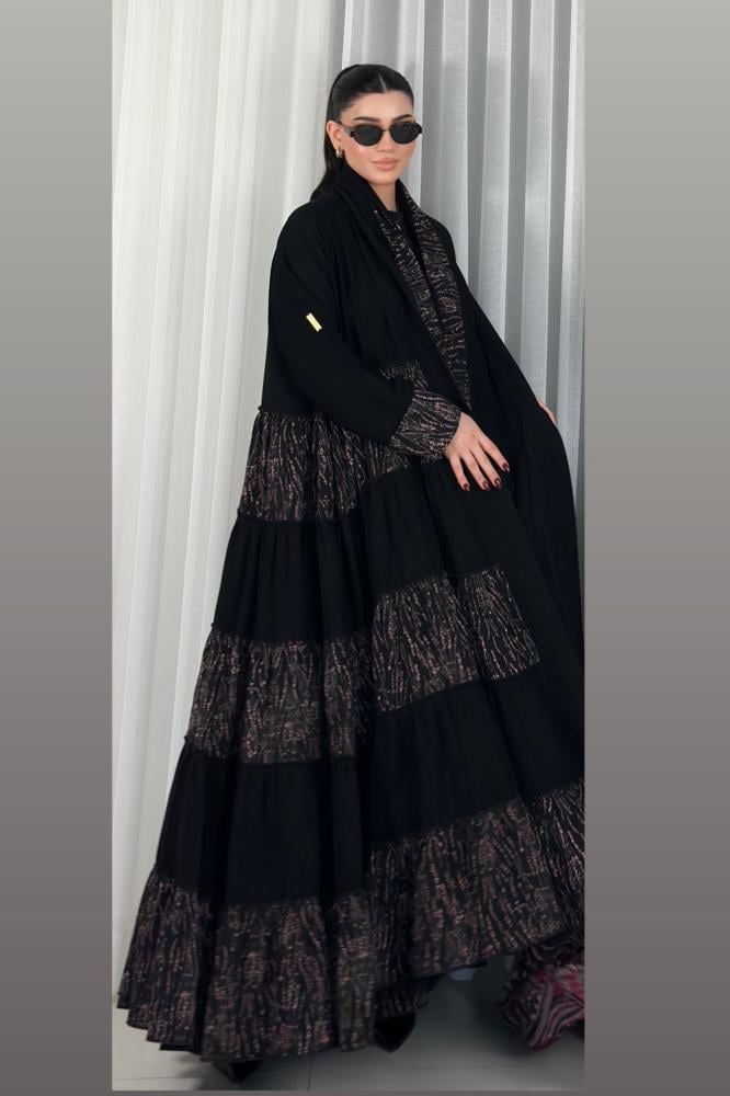 عباية طبقات دبل كلوش بخامتين كريب ملكي صيفي دبل كلوش أسود وشيفون أسود بنقشة جميلة والطرحة محددة بنفس النقشة.