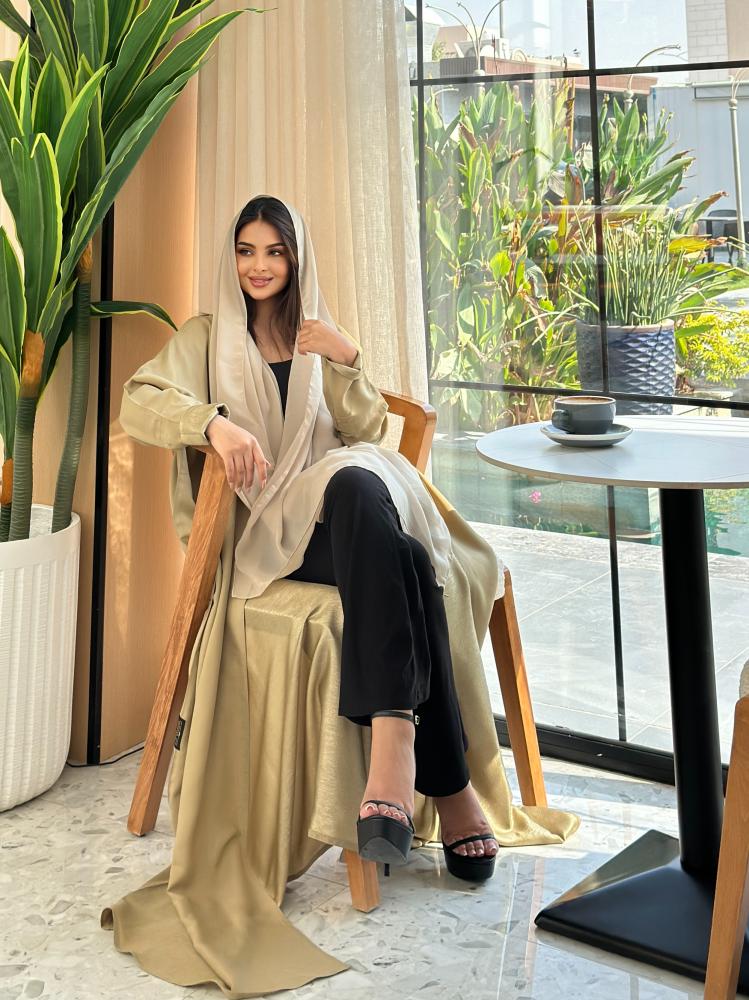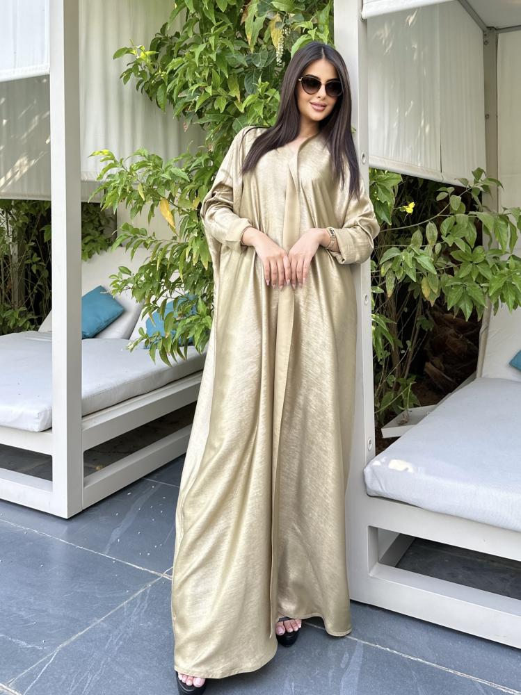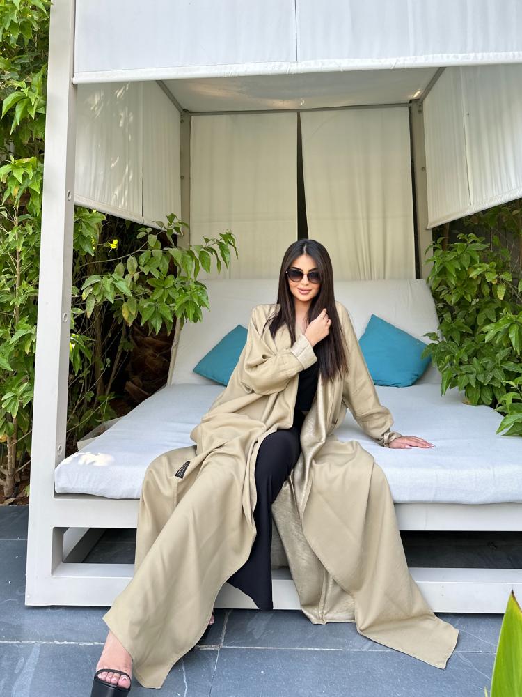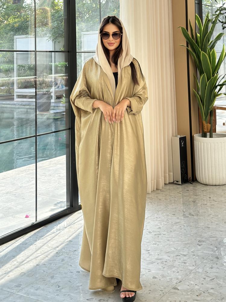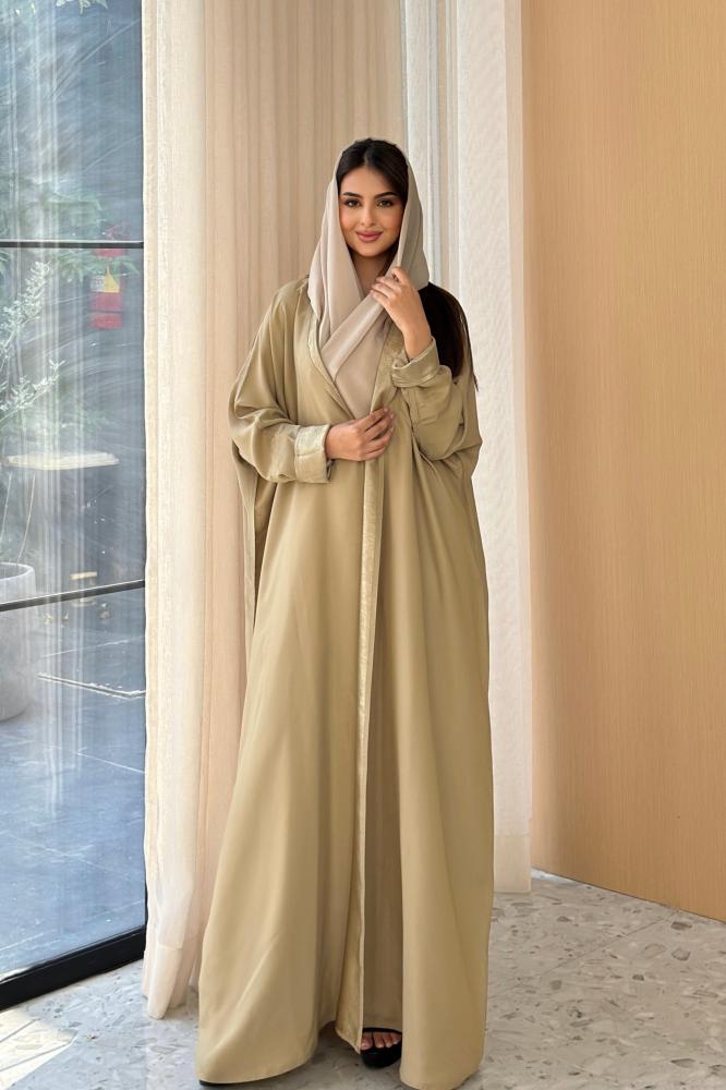 عباية حرير لاميه كوري صيفي تلبس عالوجين بيج وبيج بلمعة ذهبي مع طرحة بيج .