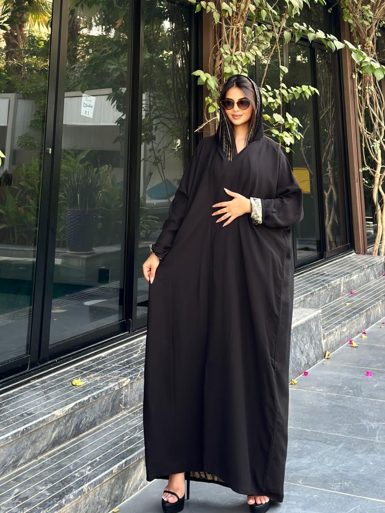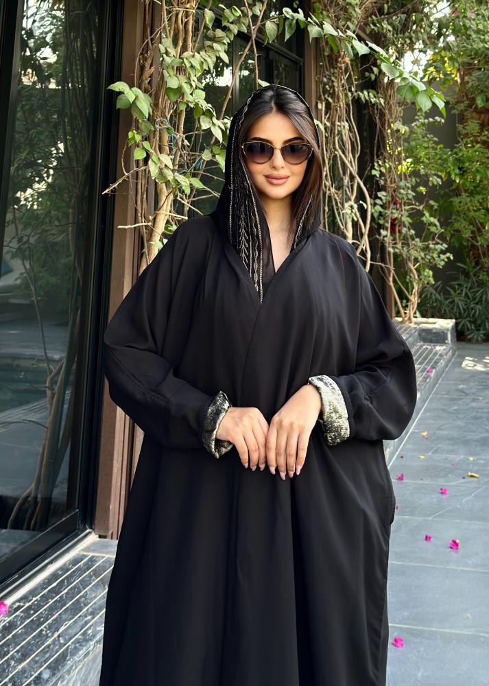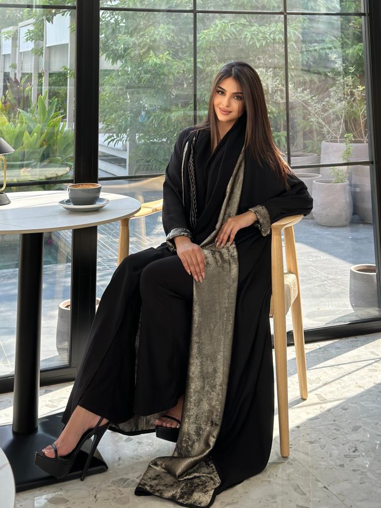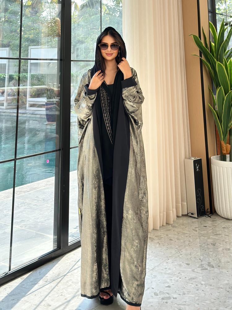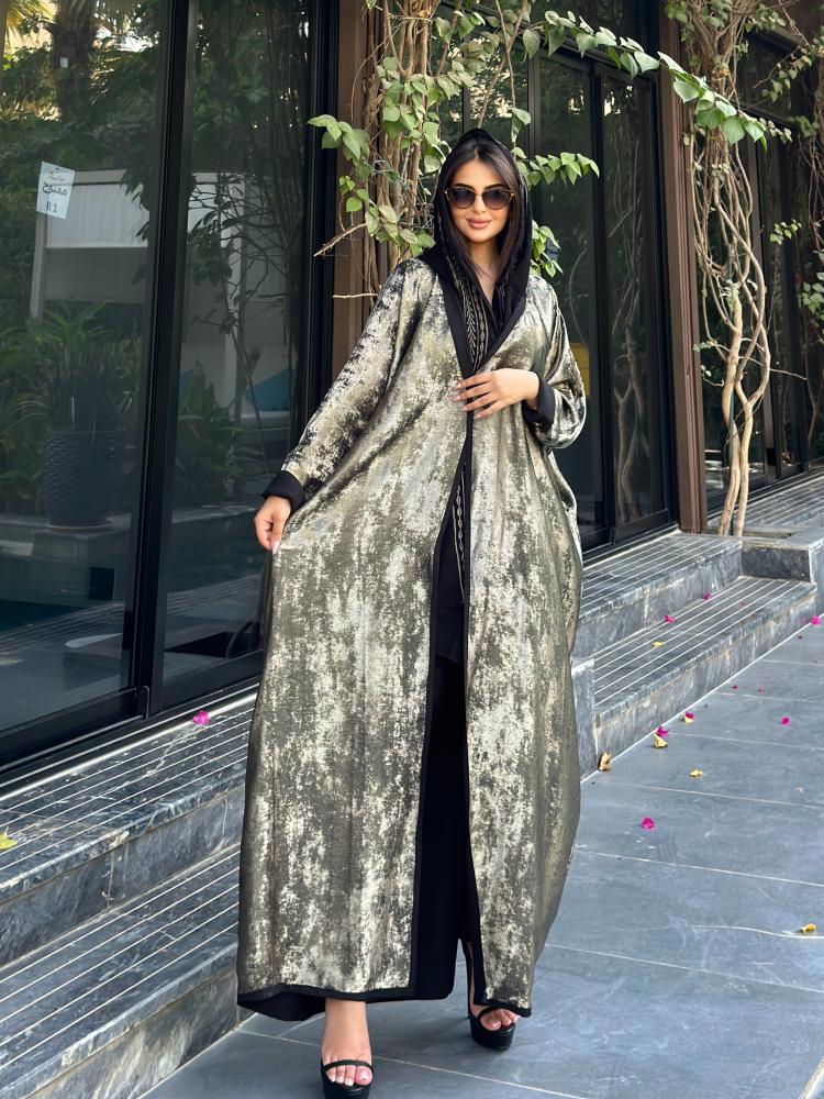 عباية حرير لامية كوري صيفي تلبس عالوجهين الأسود والذهبي مع طرحة أسود مطرزة ذهبي نفس الصور .