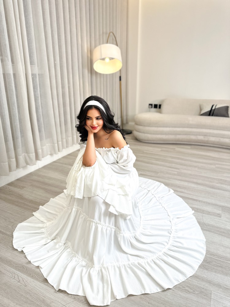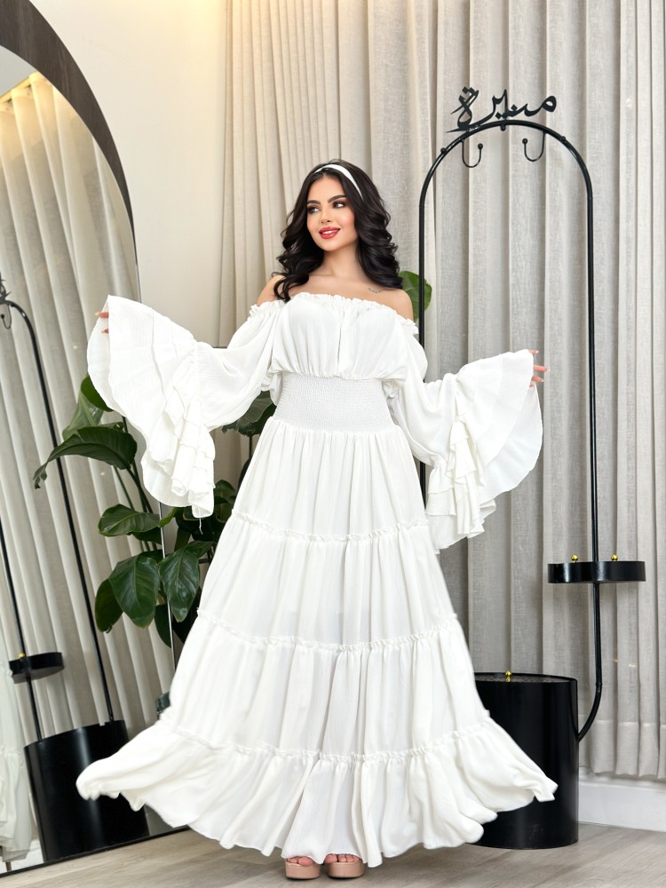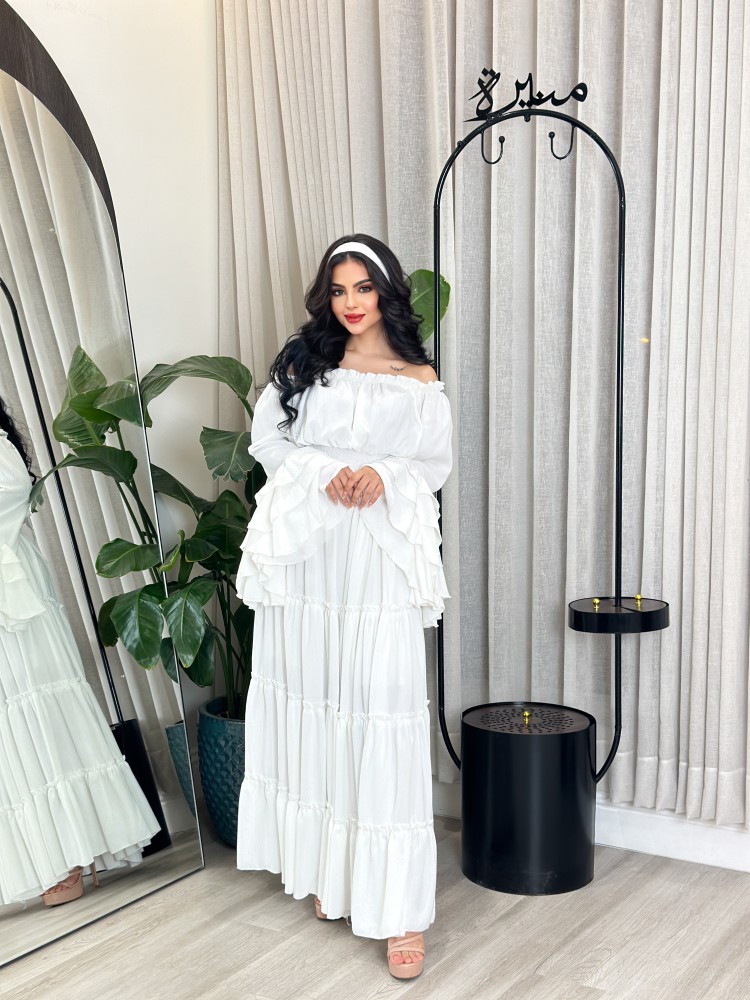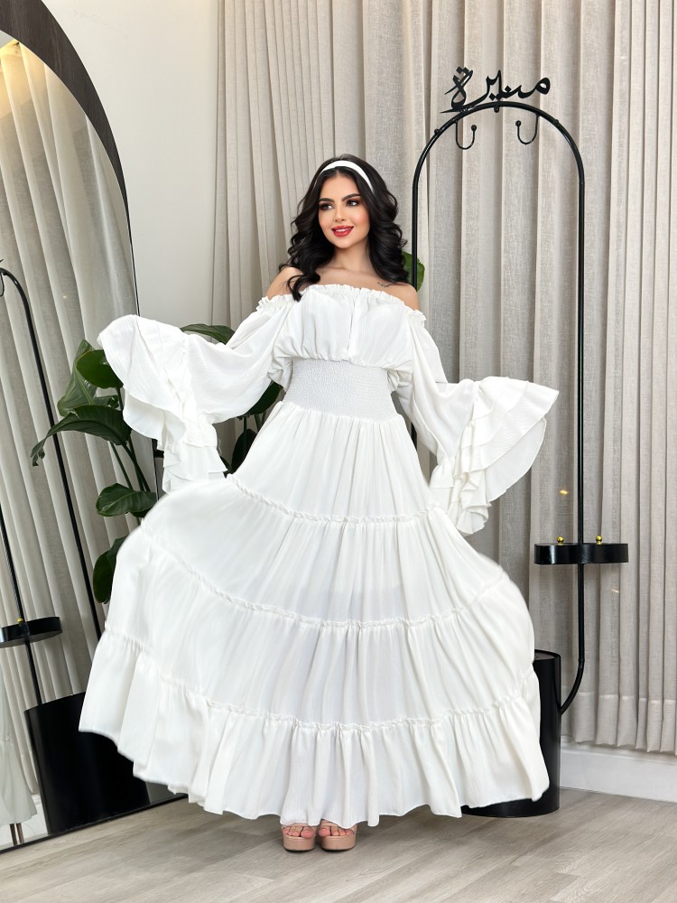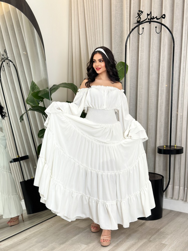 فستان طبقات أوف وايت مريح باللبس يتمدد عند الخصر بإمكانك لبسه أوف شولدر او عالكتف
