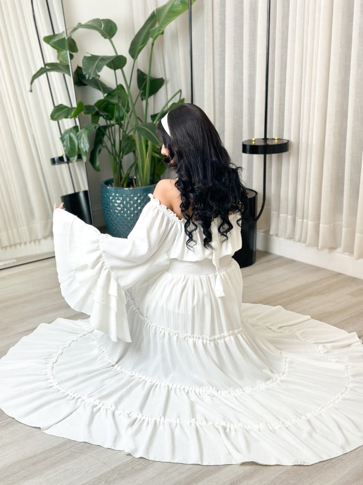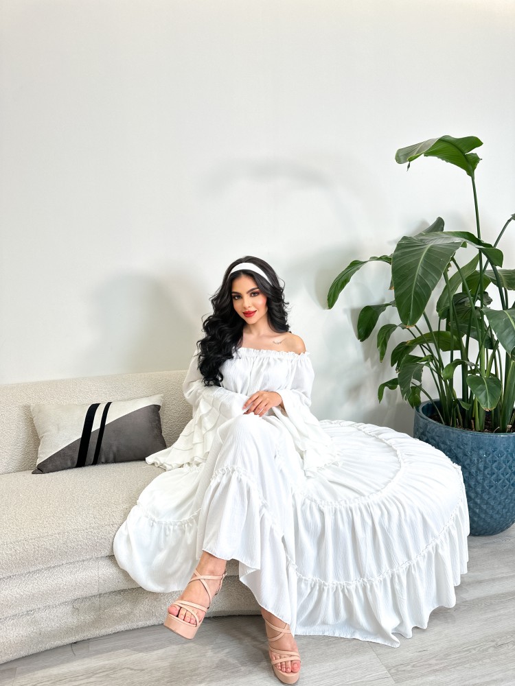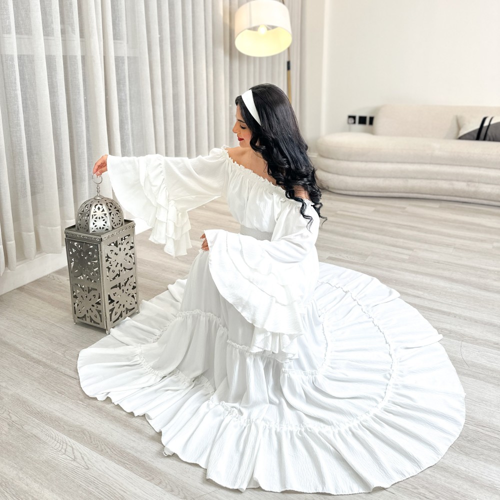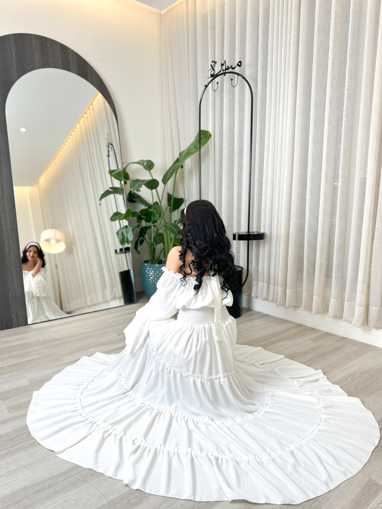 فستان طبقات أوف وايت مريح باللبس يتمدد عند الخصر بإمكانك لبسه أوف شولدر او عالكتف